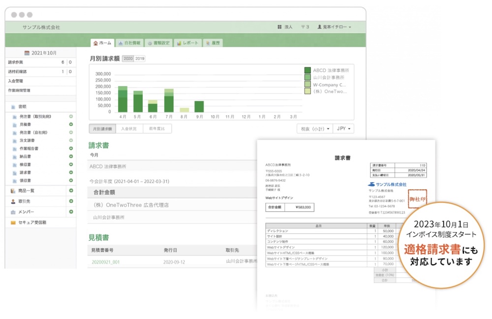 クラウド上で、見積書や請求書、領収書などの9種類の書類の作成が可能であり、銀行口座と連動しての入金管理も可能となっています。