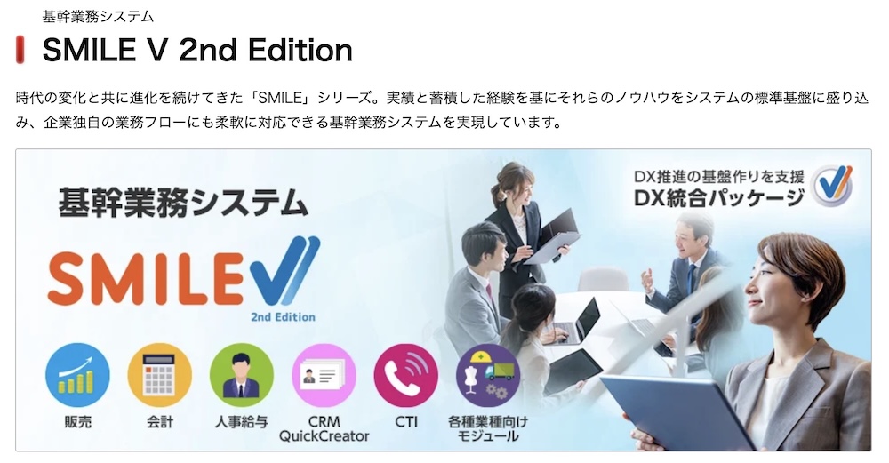「SMILE V 2nd Edition」は、販売、会計、人事給与などの基幹業務システムと、ワークフロー、ドキュメント管理などの情報系システムを同一基盤で運用でき、部門を超えた情報共有と業務効率化が図れます。